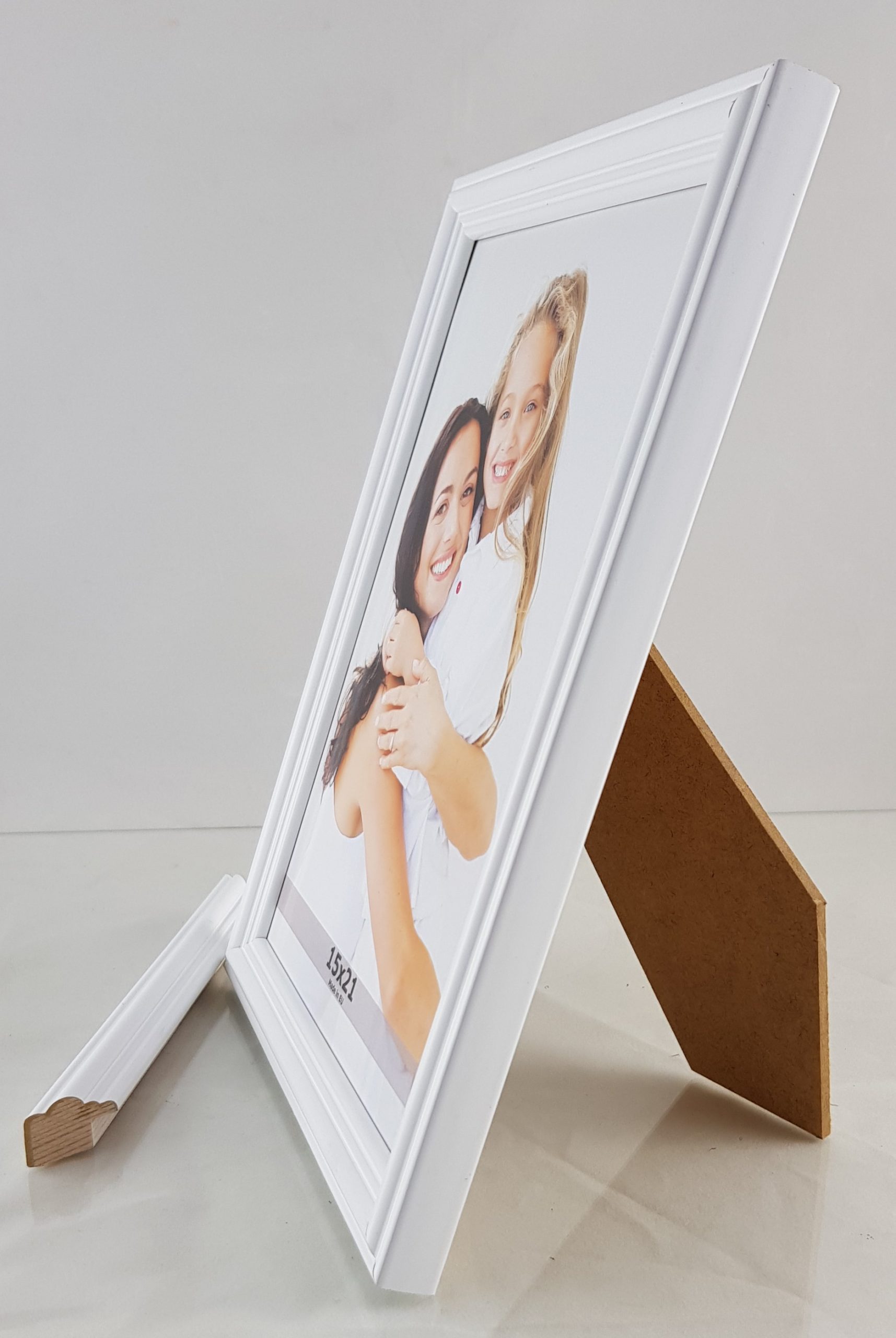 - Tył ramki wykonany jest z 3,2 mm HDF, czyli pilśnie gładkiej płyty z obu stron. Do formatu 21×29,7 dodatkowo montujemy podpórkę, umożliwiającą postawienie ramki na biurku. Ramka posiada również zawieszkę, umożliwiającą jej powieszenie na ścianie.