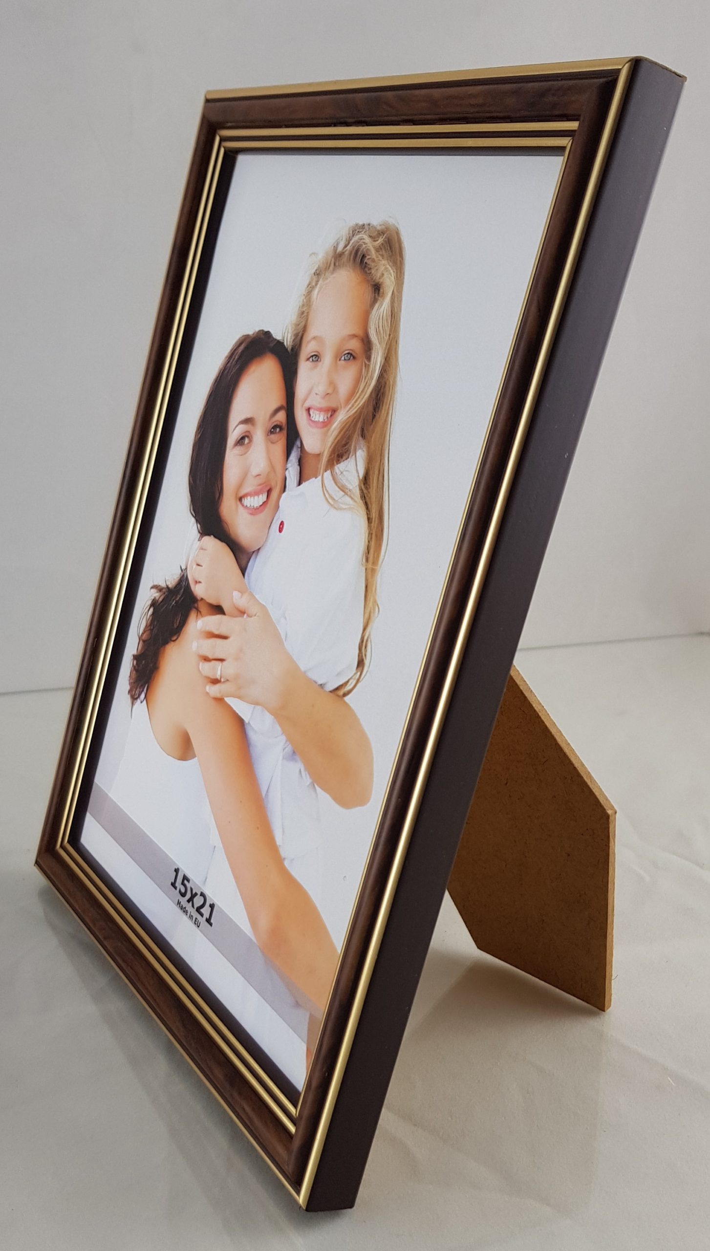• Tył ramki wykonany jest z 3,2 mm HDF, czyli pilśnie gładkiej płyty z obu stron. Do formatu 21×29,7 dodatkowo montujemy podpórkę, umożliwiającą postawienie ramki na biurku. Ramka posiada również zawieszkę, umożliwiającą jej powieszenie na ścianie.