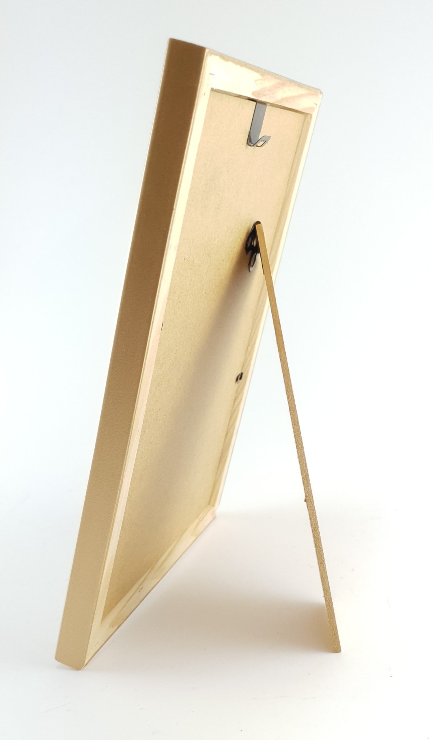 - Tył ramki wykonany jest z 3,2 mm HDF, czyli pilśnie gładkiej płyty z obu stron. Do formatu 21×29,7 dodatkowo montujemy podpórkę, umożliwiającą postawienie ramki na biurku. Ramka posiada również zawieszkę, umożliwiającą jej powieszenie na ścianie.